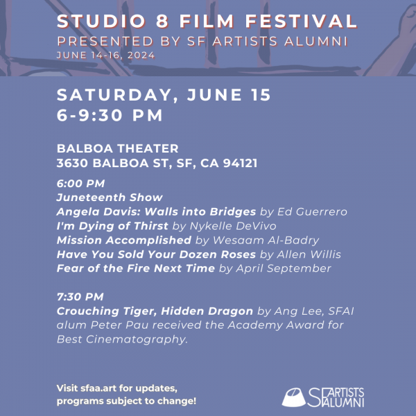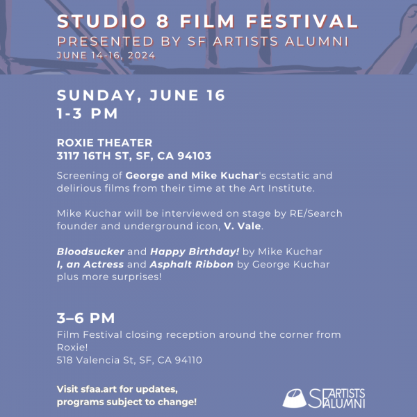 Named after the legendary Studio 8 at SFAI’s 800 Chestnut Campus, this will be the inaugural Studio 8 Film Festival presenting works by SFAI alumni and former faculty!