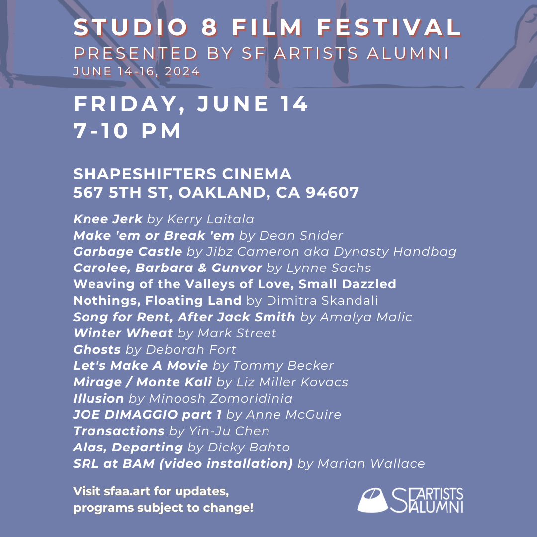 The STUDIO 8 Film Festival is a 3-day event organized by the SF Artists Alumni Association to showcase the work of filmmakers who honed their craft while students at the legendary (and now-closed) San Francisco Art Institute. The opening night program features short films by Jibz Cameron, Deborah Fort, Dean Snider, Kerry Laitala, Minoosh Zomorodinia, Dimitra Skandali, Liz Miller Kovacs, Lynne Sachs, Mark Street, Yin-Ju Chen, Dicky Bahto, Tommy Becker, Anne McGuire and Malic Amalya.